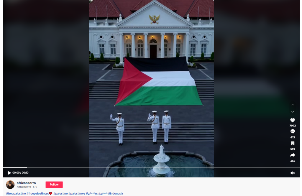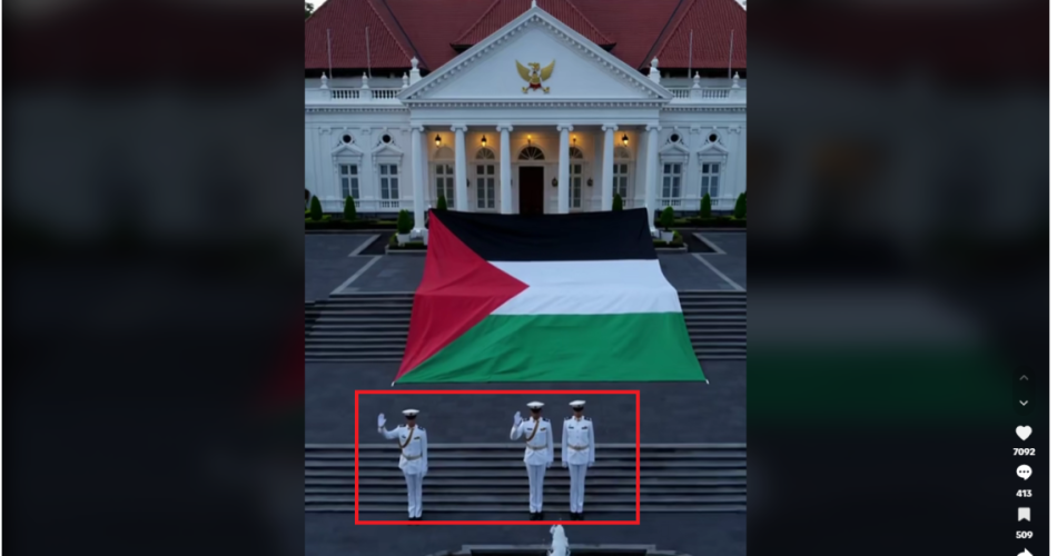 نشرت صفحات إخبارية، من بينها حسابا @trtarabi وYeni Şafak، مقطع فيديو يُظهر رفع علم فلسطين الضخم أمام بوابة قصر “إستانا نيجارا” الرئاسي في إندونيسيا، مع تعليق يفيد بأنه “لفتة رمزية تعبر عن دعم الشعب الإندونيسي للقضية الفلسطينية”.