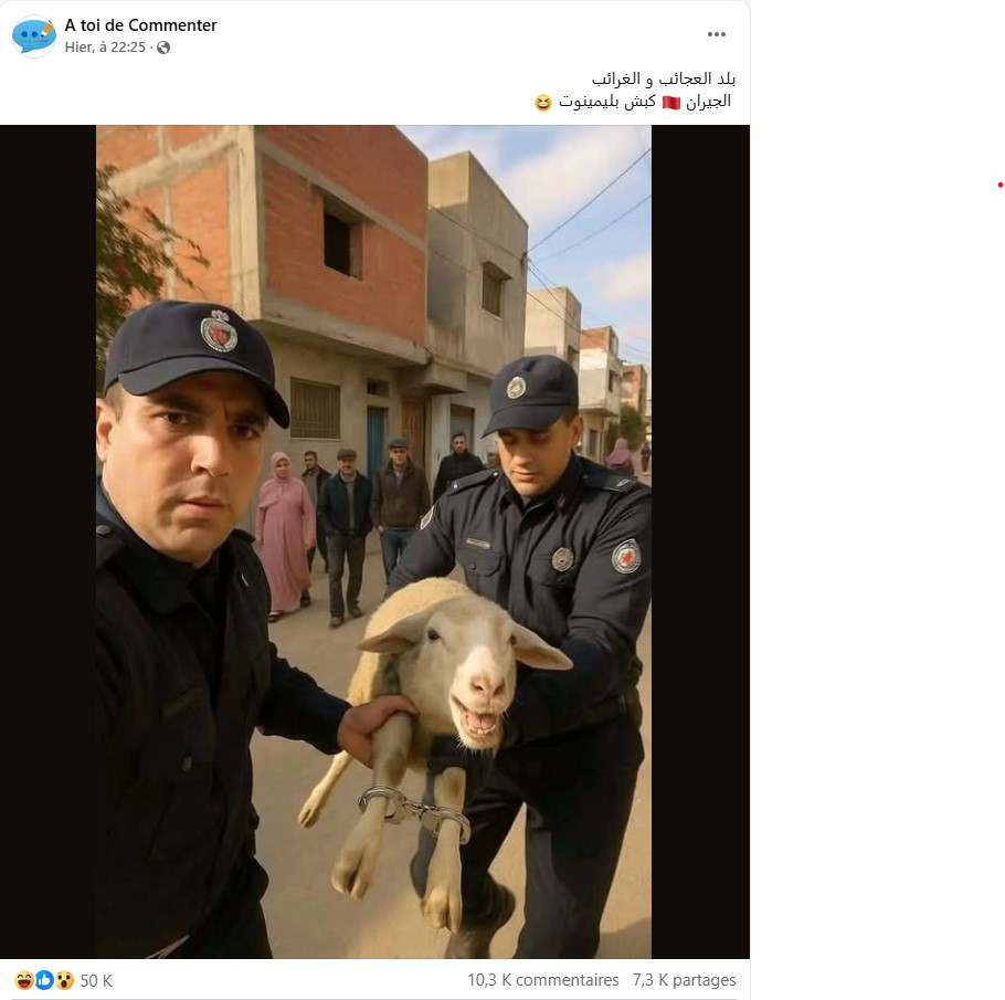 تداول مستخدمون على منصة فيسبوك، بتاريخ جوان 2025، صورة يظهر فيها كبش مقيد بأصفاد معدنية، يقف إلى جانب رجلي شرطة، مع تعليق ساخر يفيد بأن “الشرطة المغربية ألقت القبض على كبش بعد مصادرته من إحدى العائلات قبل عيد الأضحى”.