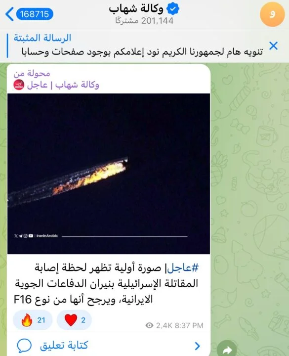 تداولت صفحات إخبارية وحسابات على مواقع التواصل صورة قيل إنها توثّق لحظة إصابة مقاتلة إسرائيلية بصاروخ إيراني خلال الهجوم الإسرائيلي الأخير على مواقع في طهران. وادعى ناشرو الصورة أن الطائرة من طراز F-16.