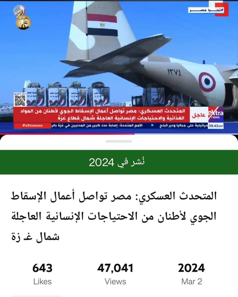 “مصر تواصل أعمال الإسقاط الجوي للأطنان من المواد الغذائية والاحتياجات الإنسانية العاجلة شمال قطاع غزة”.