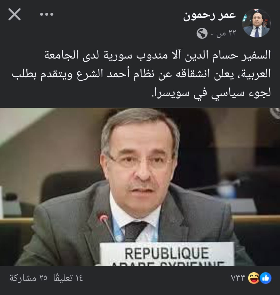 تداول حساب “أخبار روسيا الاتحادية” على منصة X (تويتر سابقًا)، إلى جانب صفحات على منصات التواصل الاجتماعي، خبراً يزعم أن مندوب سوريا في الجامعة العربية، حسام الدين آلا، أعلن انشقاقه عن النظام السوري وتقدّم بطلب لجوء سياسي إلى سويسرا.